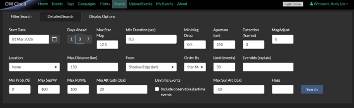 国内外许多组织和单位建立了小行星掩星预报网站,主要包括紫台掩星预报网站、OWC网站、LuckyStar预报网站等。其中,OWC网站具有筛选和规划功能,易于快速找到适合自己设备和观测环境的事件。使用方法大致是,首先在网页注册账号,然后在“Detailed Search”中设置参数筛选,重点关注三个指标:目标恒星亮度(Max Star Mag)、预计掩星时长(Min Duration(sec))和最小减光亮度(Min Mag Drop)。以我们使用的C925望远镜(235mm口径)为例,1秒曝光下可拍摄的充足信噪比的最低星等约为14等,实际观测时,为了获得较高的时间分辨率,往往需要选择更亮1-2等的目标。同时,需要注意光害对观测的影响。