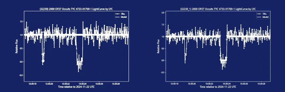 两次完全减光的信号赫然展现在光变曲线上,第一次掩星持续0.19秒,第二次掩星持续0.73秒,中间间隔4.37秒,其中第二次减光的中间时刻为21:30:23.60,早于预报的时刻。完全减光,且间隔较长的“双掩”特征,极可能是因小行星存在卫星而造成的二次掩星!张老师的观测数据获得了接近的结果,他立即联系紫台的袁烨副研究员上报数据。经过更严谨的数据处理,以及长时间的小行星自转光变确认后,紫台掩星团队排除了小行星的特殊地形,确认了8.1km弦长的(32230)小行星拥有一颗直径至少为2.4km弦长的卫星。