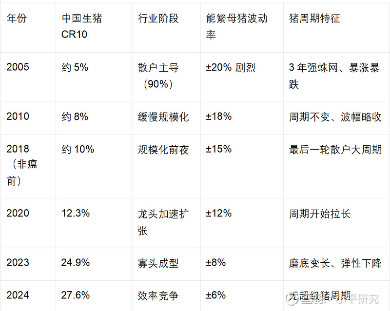 “产能大起大落”是旧周期的核心标志,而新周期的产能特征,将是“只微调、不出清”——这正是美国工业化阶段的核心规律,未来也将在中国落地。牧原、温氏等龙头企业,凭借充足的现金储备和极致的成本优势,即便在深度亏损期,也会坚守核心产能,仅通过调整出栏节奏、淘汰低效母猪优化种群,不会大规模去产能;能繁母猪波动率将永久降至5%以下,大规模产能出清成为历史,与之相伴的“超级反弹”行情也将难觅踪迹。散户逐步退出后,龙头主导产能,供给稳定性大幅提升,周期的“起伏感”自然变弱。