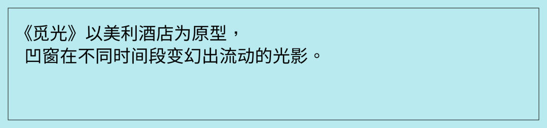 《觅光》的灵感来自位于中环的美利酒店,酒店由政府大楼改建而成,外墙纯白,窗户为正方形的45度斜角嵌入式凹窗。2018年入住酒店时,某天阳光正盛,Mary在酒店旁寻找通往山顶的缆车车站,站在斜坡上,她看到光影在凹窗上变幻,感慨硬朗的建筑也拥有流动之美,驻足观看许久。
