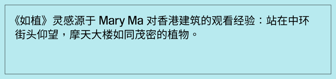 晚高峰的地铁拥挤嘈杂,周围人神色疲惫。和我一起挤在车厢里的Mary毫无疲态,仿佛与外界隔离般,沉浸于讲述之中。说话间,我们差点错过下车。多亏中环站标志性的红色马赛克瓷砖及时跳入眼中。从J2出口出站后,即遮打花园。夜风微热,坐在花园长椅上的人不多。站在花园一侧,Mary抬头望向中银大厦、长江集团中心。中银大厦由贝聿铭设计,以竹子「节节高升」为灵感,由四个三角柱体组成多面棱形,在夜色里依旧棱角分明。楼高62层的长江集团中心结构方正,巨型玻璃幕墙铺满灯光。她说,「站在这里看的话,你不觉得城市像茂密的森林吗?」某次从地铁站出来,她脑海里突然闪过这个想法,于是决定用布料将坚硬的建筑转译为有生命力的植被。