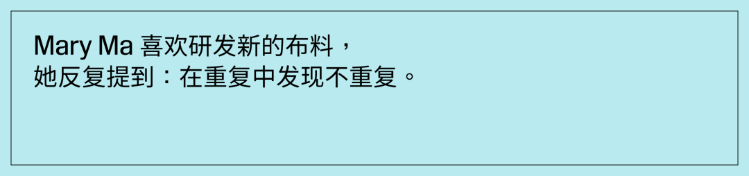 就像她小时候喜欢的综艺节目《超级变变变》,Mary说,布料也拥有某种魔法,用不同的纱线、不同的工艺、不同的视觉,她能够将它呈现出无穷无尽的组合。不过,「只有像我们做布料做得已经有点神经病的人才会这么做」,她觉得自己拥有太多的执念——做一个印花视觉,为了找出最合适的底布,可能会做200多种不同的布料。也许,团队也被她「折磨」——有员工问过她,你每天到底几点睡觉?Mary睡眠浅,手机不会调成静音,只要听到有消息震动,无论凌晨4点还是早上6点,她都会回复。