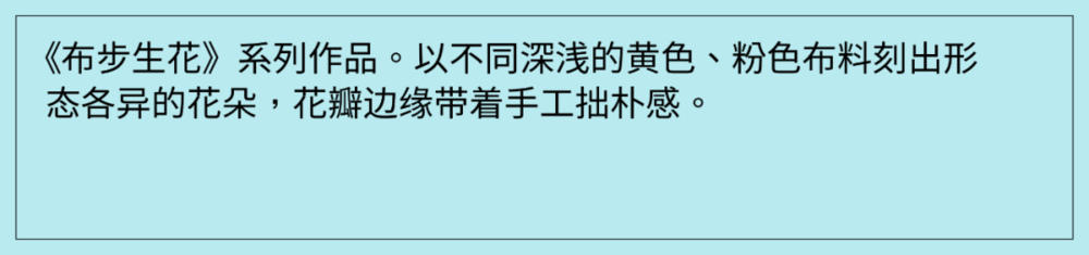 茶室不大,木制地板,米色墙面,给人一种素净之感。展览位于二层,但先别急着上楼——楼梯旁是「布步生花」系列作品中的第一幅。以不同深浅的黄色、粉色布料刻出形态各异的花朵,花瓣边缘带着手工拙朴感,和茶室安静松弛的氛围浑然相融。