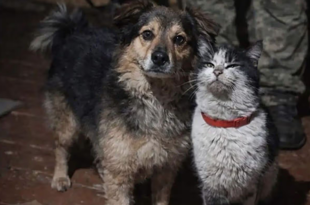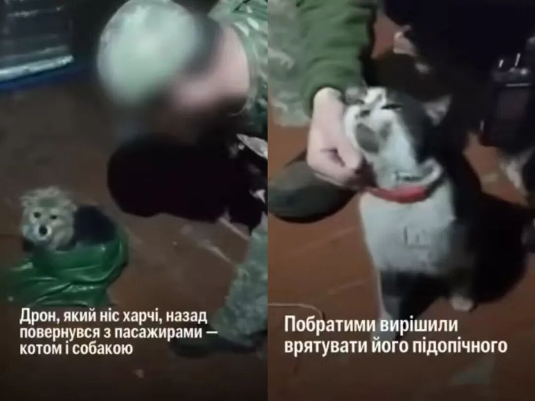 那架无人机原本是要运送物资的,但情急之下,发现这对猫狗的乌克兰士兵找了个袋子把它们兜着一起送走了。