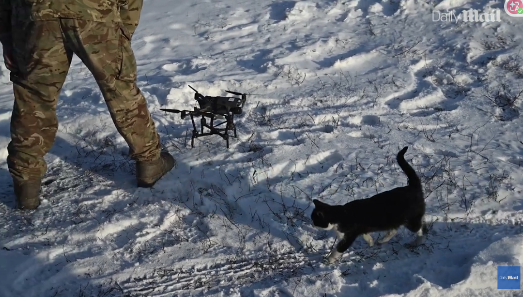 每当这只小猫听到远处有无人机接近的声音,就会开始大声“喵喵喵”地嚎叫,冲向掩体。