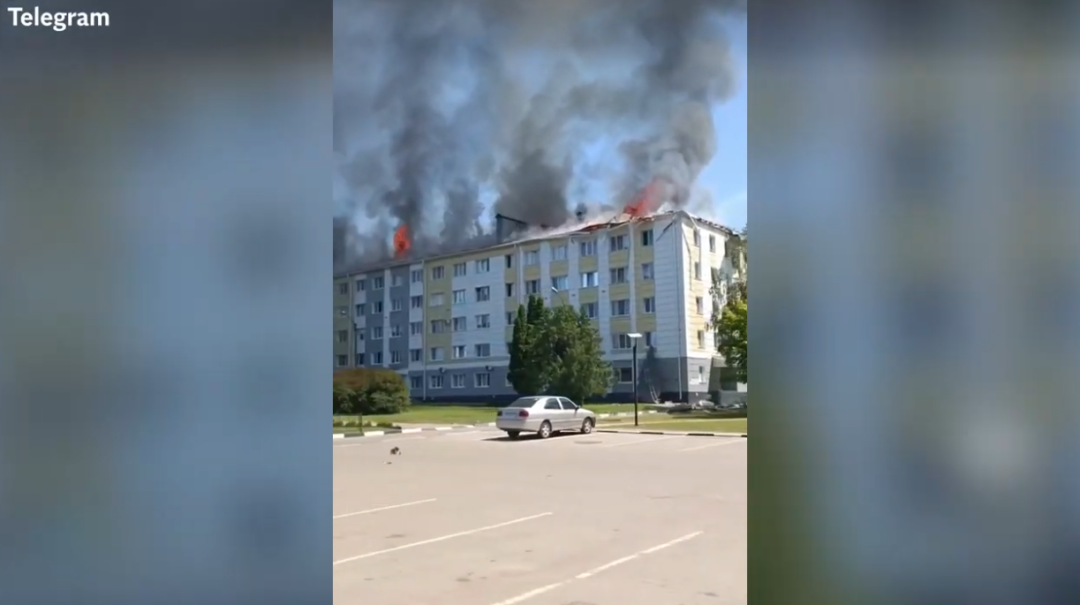 谢贝基诺的市政大楼遭炮击后起火。(视频截图)