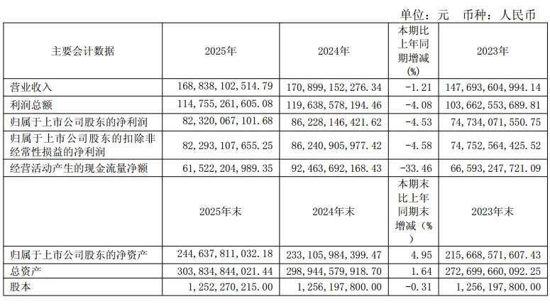 2025年营业收入1688.38亿元,同比下降1.21%;归母净利润823.20亿元,同比下降4.53%,这是贵州茅台上市以来首次出现营收净利双下滑。