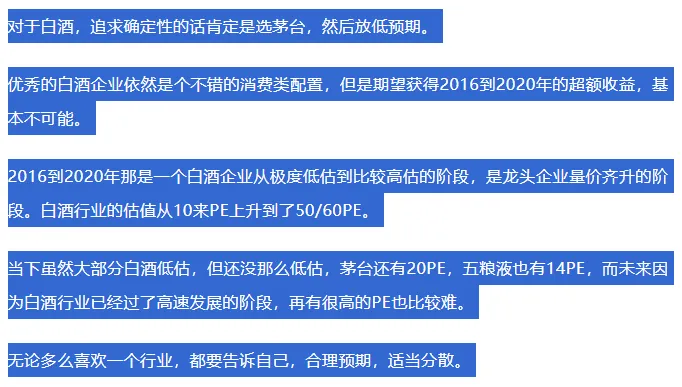 但是另一方面,虽然白酒总量下降,但随着收入提升和喝酒的观念改变,喝中高端白酒的人会增加我认为这个逻辑也是通顺的。我们不是买整个行业,我们是买未来那部分受益于消费提升的企业