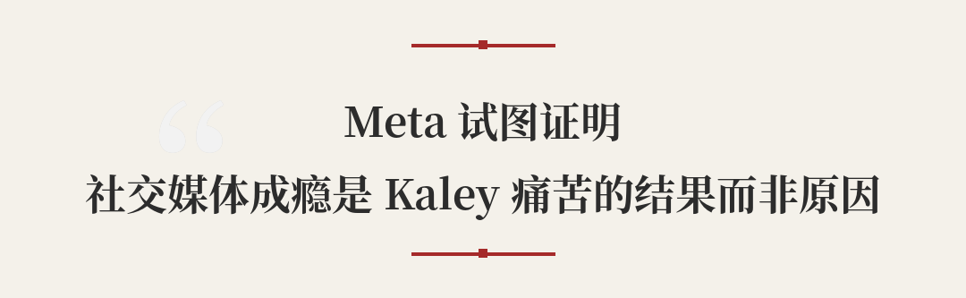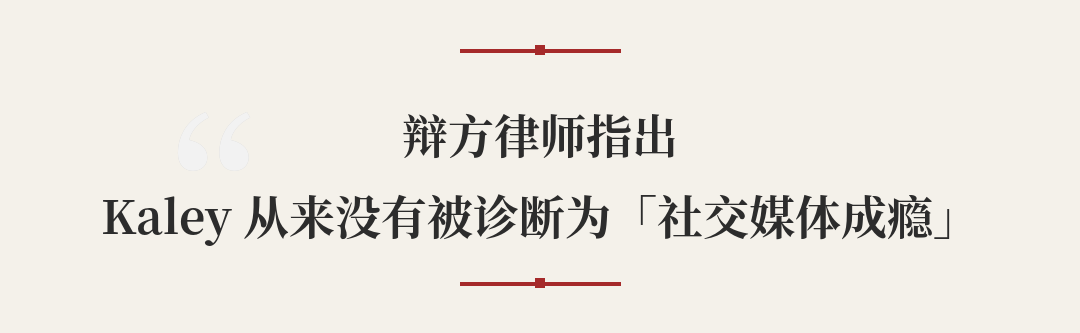 Jones还指出,Kaley从来没有被任何医生或心理健康提供者诊断过”社交媒体成瘾”,没有任何治疗师让她限制使用Instagram。整个”成瘾”的框架——原告案件的核心——不是临床专业人士的诊断,是原告律师的论证。