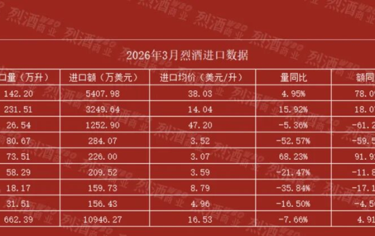 2026年3月烈酒进口数据:白兰地进口额增长78.09%,多个白色烈酒品类下滑
