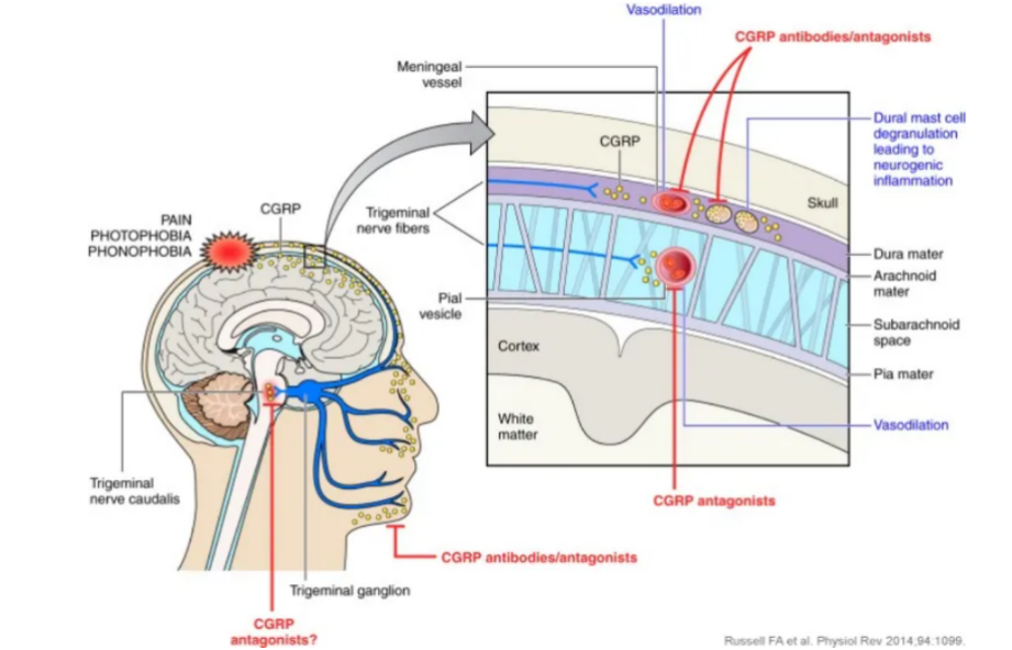 图:CGRP抑制剂作用机制,来源:《生理学评论》