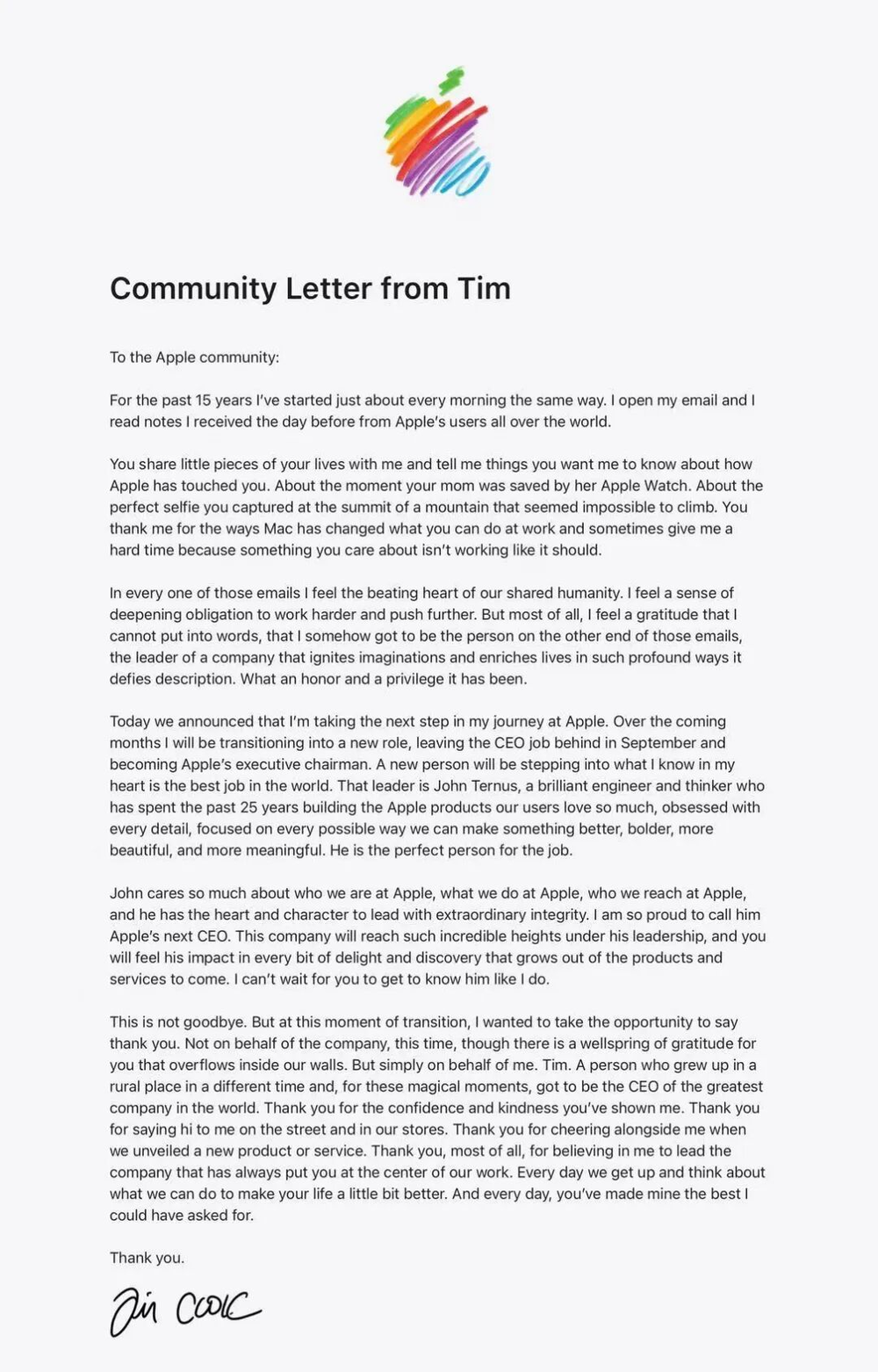 即将卸任CEO的库克,也在今天向全球苹果用户发布了一封感谢信,感谢用户在他15年的任期之中每天分享自己使用苹果产品的生活点滴。