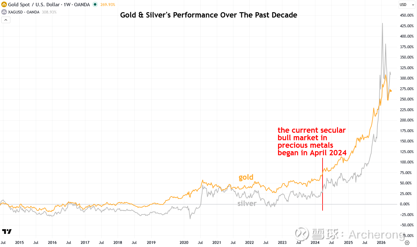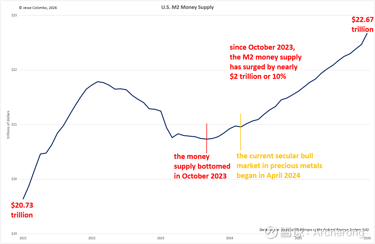 我想指出,美国M2货币供应量触底反弹仅仅六个月后,贵金属的长期牛市就开始了。我认为这并非巧合,而是贵金属价格在此时飙升的主要原因之一。