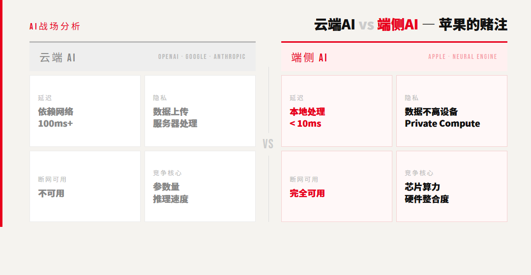 苹果的端侧AI战略,本质上就是这套逻辑的延伸:当AI从云端走向设备端,当数据处理发生在你的口袋里而不是某个数据中心,谁控制了芯片,谁就控制了AI体验。