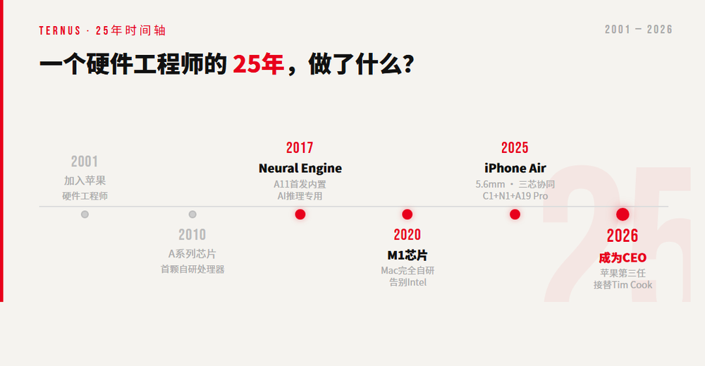 Ternus特努斯是这一切的主导者。他曾在采访中说,苹果过去二十年最深刻的变化,就是把越来越多的核心技术掌握在自己手里,“从别人的约束中解放出来”。