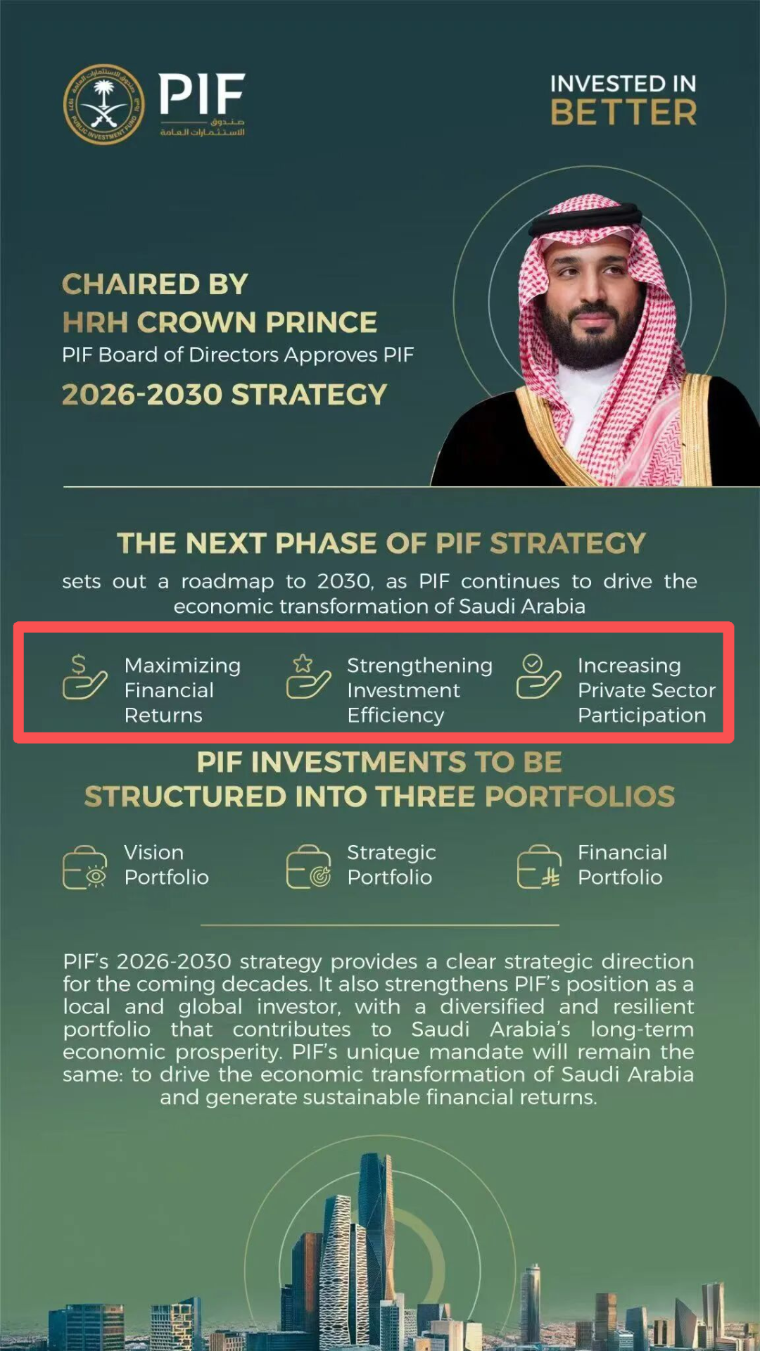 4月15日,PIF董事会正式批准2026—2030战略。官方新闻稿里的关键词写得非常直白:提高财务回报,强化投资效率,吸引更多私营资本参与。