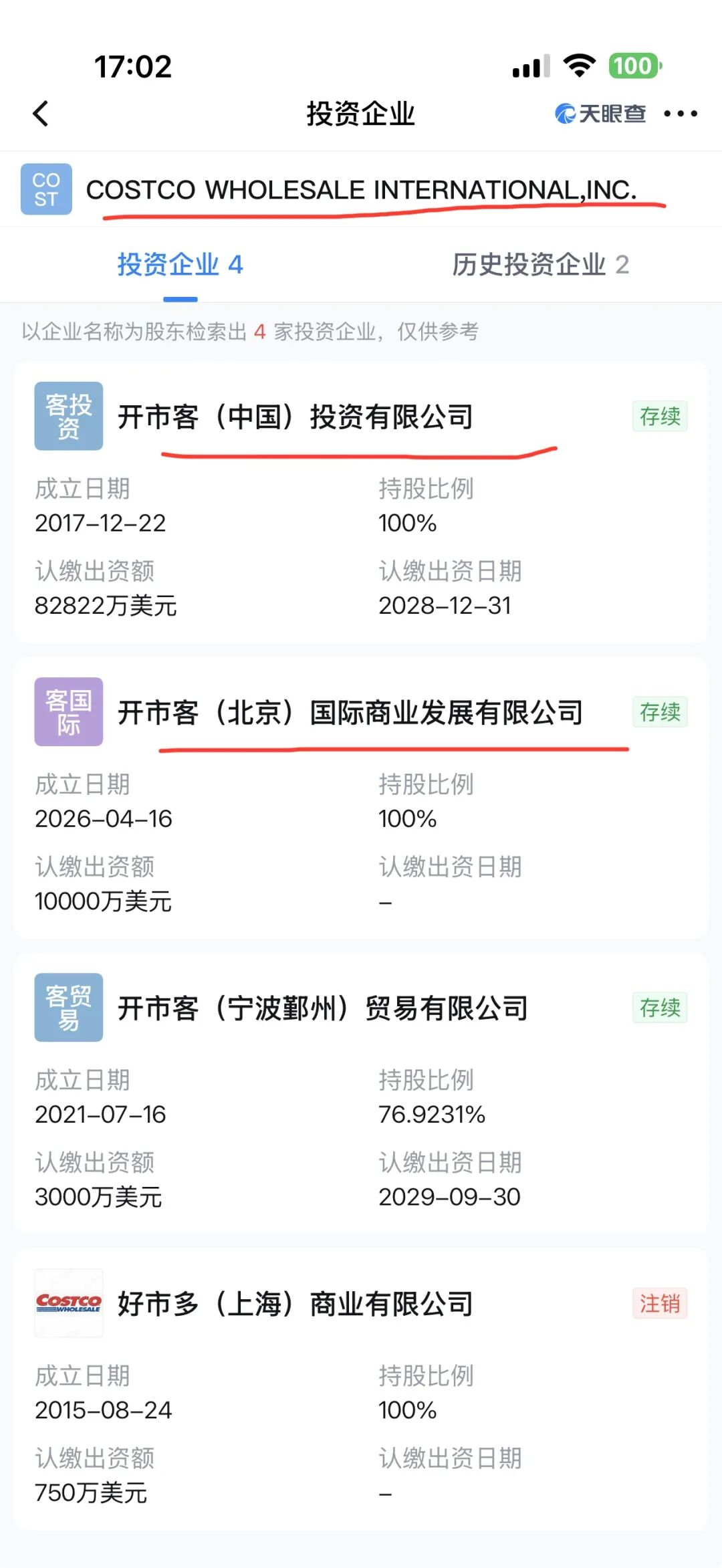值得关注,且让人迷惑的是,《零售圈》通过企查查和天眼查对开市客(北京)国际商业发展有限公司股权结构进行了查询,两家查询结果均显示,开市客(北京)国际商业发展有限公司与目前已经在中国大陆地区开设7家门店的开市客(中国)投资有限公司同属一个全资控股公司,即:COSTCO WHOLESALE INTERNATIONAL,INC。