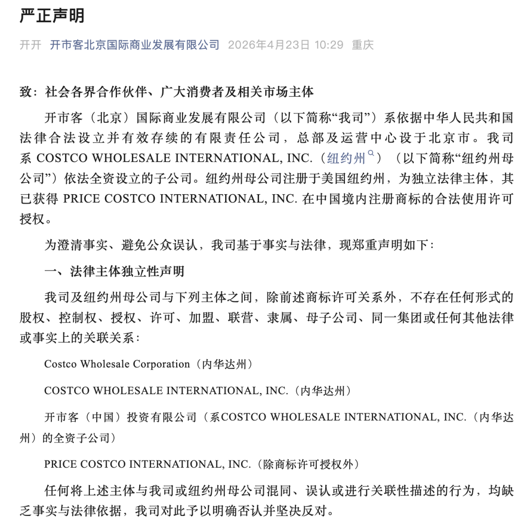 在发稿之前,《零售圈》获得了《开市客北京国际商业发展有限公司》公众号发布的一则严正声明,该声明的核心是表达他们作为在北京和纽约注册的公司,是独立的法律主体,同时他们声明:开市客北京国际商业发展有限公司、COSTCO WHOLESALE INTERNATIONAL,INC(纽约州)两家公司和Costco Wholesale Corporation(内华达州)、开市客(中国)投资有限公司、COSTCO WHOLESALE INTERNATIONAL,INC(内华达州)不存在任何形式的股权,控制权、授权、许可、加盟、联营、隶属、母子公司、同一集团或任何其他法律或者事实上的关联关系。