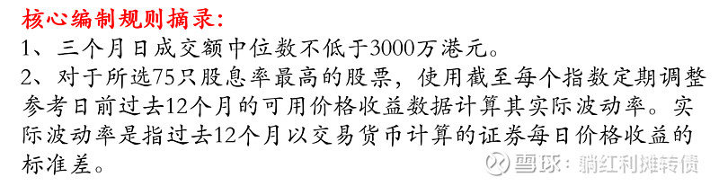 标普系的指数公开资料比较难整理,躺师傅在官网也只是找到了标普港股通低波红利指数的部分编制规则,不过在这些规则中并没有看到关于异常分红样本的剔除规则,不过指数关于股价波动率的限制也许能将这些异常分红的样本排除在外吧,而且指数对成分股流动性的要求还是比较高的,入选港股通的大公司出现这类大手笔分红的操作应该是比较小的。