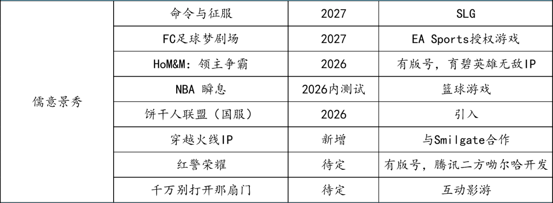 儒意景秀一方面与海外厂商合作,拿IP授权自研或引入经验证的游戏,一方面又与腾讯二方工作室合作,扩充产品线。