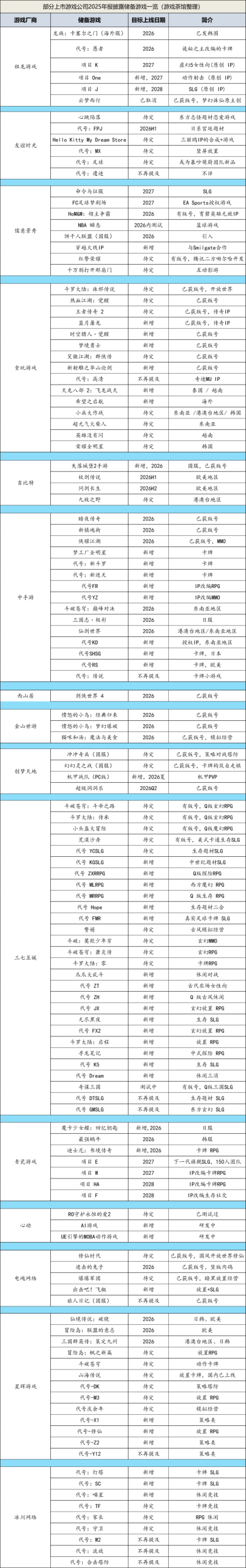 随着上市游戏厂商陆续披露2025年年报,将公司去年整体运营情况向投资人交卷。除了业绩外,游戏厂商还前瞻性披露了自家储备游戏阵容,虽然其中不少都还只是一个暂定名。