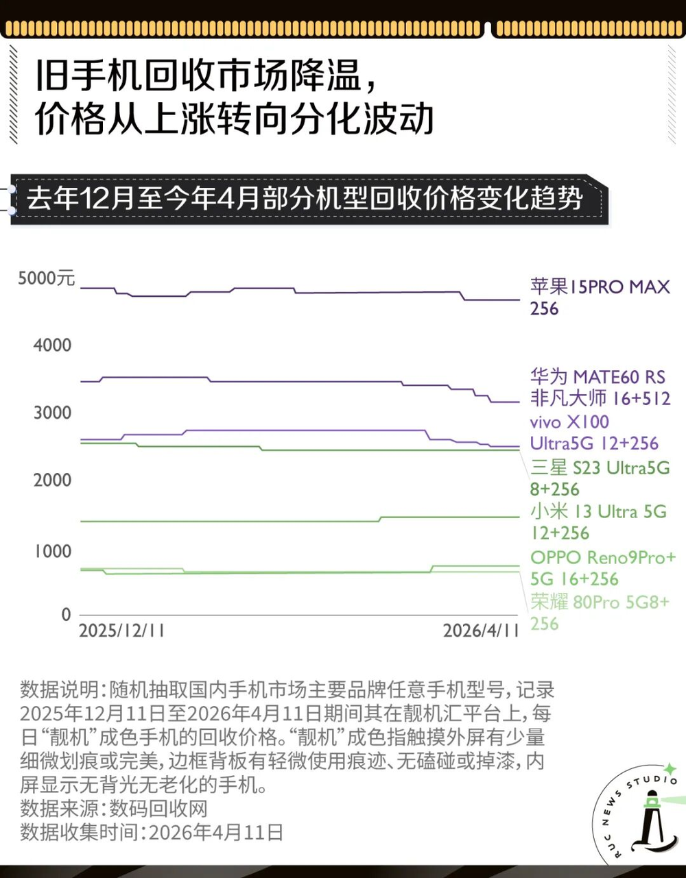 数据显示,一季度中高端机型回收价平稳,甚至部分机型价格缓慢下行。而进入四月,此轮废旧机市场上涨周期已有明显回落趋势。