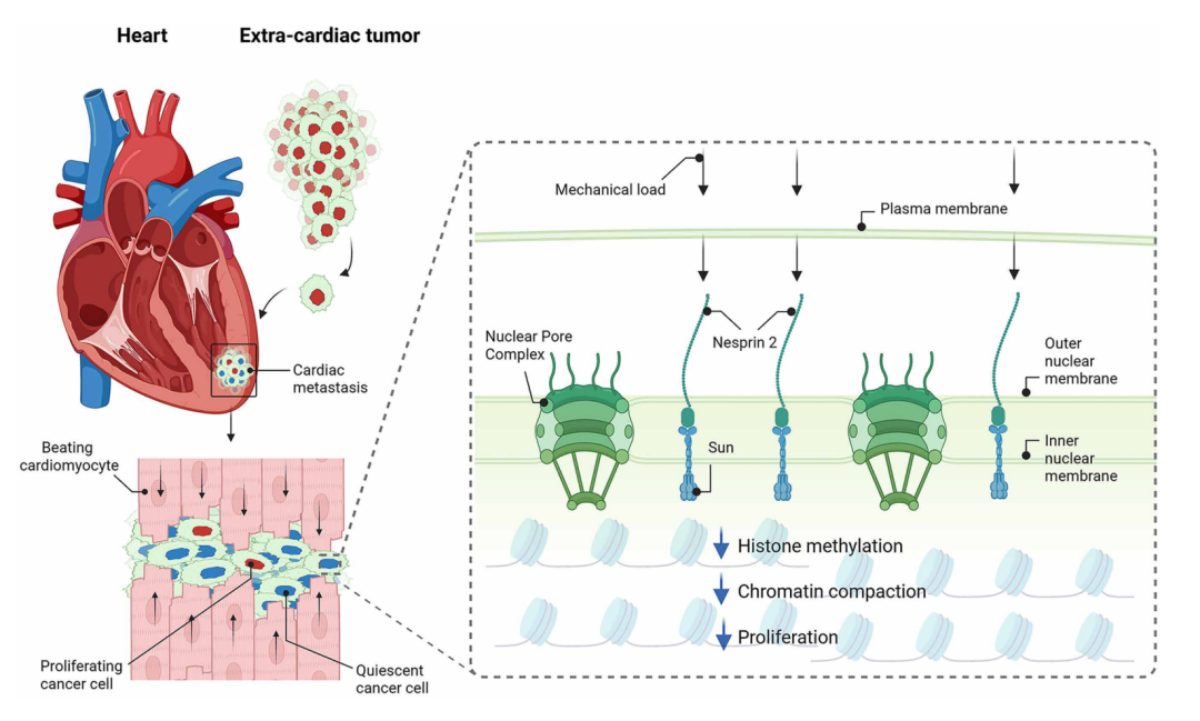 抑制心脏中癌细胞增殖的关键机制:植入心肌的癌细胞会受到心肌细胞收缩以及心脏跳动产生的机械力的影响。Nesprin-2是感知这些机械力的关键分子,从而导致癌细胞中组蛋白甲基化减少和染色质松散,最终抑制癌细胞增殖。
