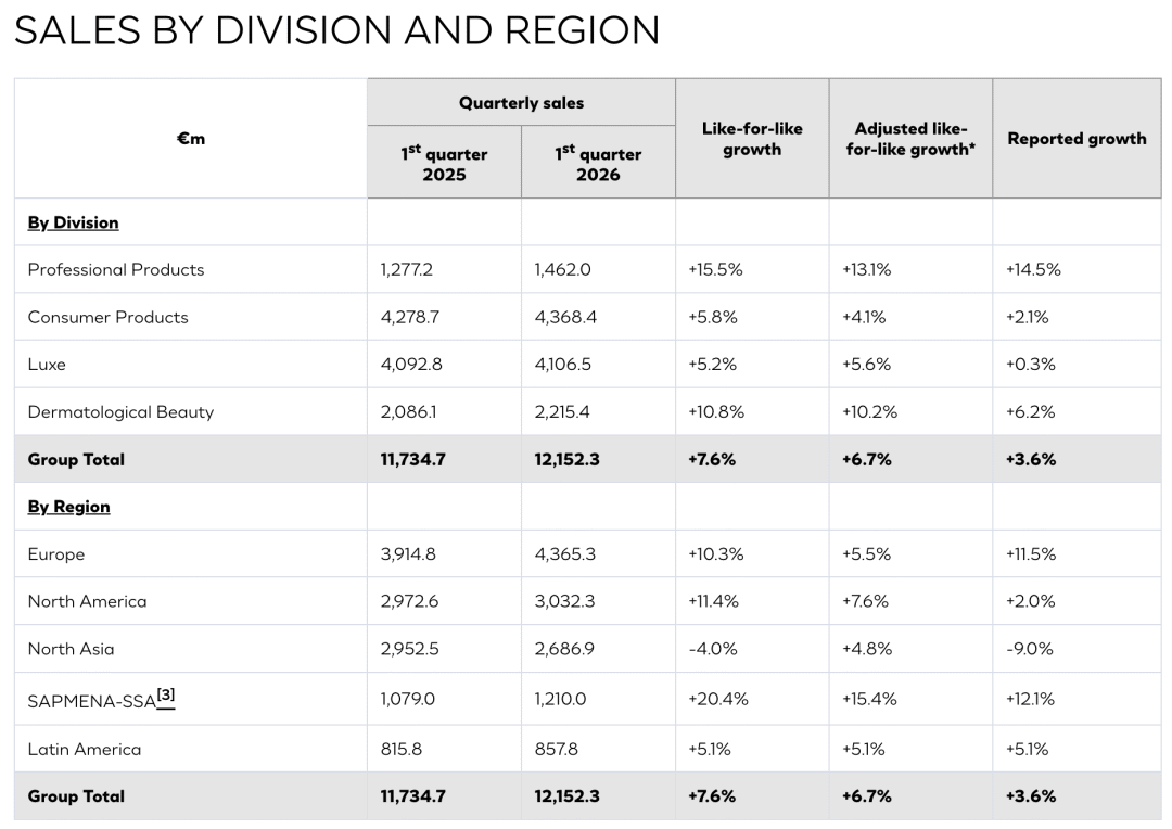 4月23日,全球最大美妆集团欧莱雅发布2026年第一季度财报,交出远超市场预期的成绩单。报告期内,集团实现销售额121.52亿欧元(约合人民币1008亿元),按可比口径同比增长7.6%(名义增长3.6%),显著跑赢全球美妆市场整体表现。