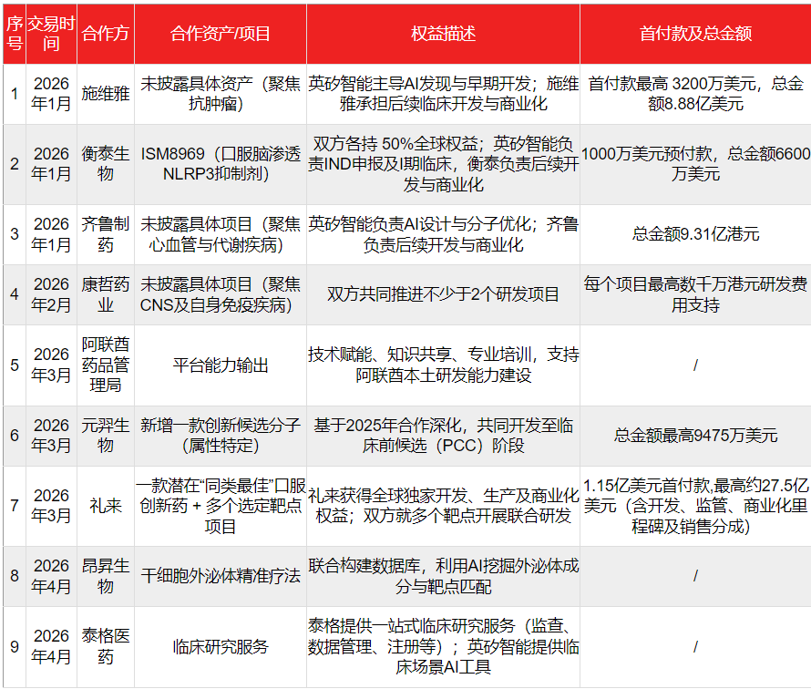 从此维度看,2026年前四个月其已密集官宣9项新合作,涵盖礼来、施维雅、齐鲁制药、康哲药业等跨国及本土大药企,并拓展至泰格医药(CXO)和Liquid AI(模型公司),覆盖肿瘤、自免、CNS、代谢等多个疾病领域。