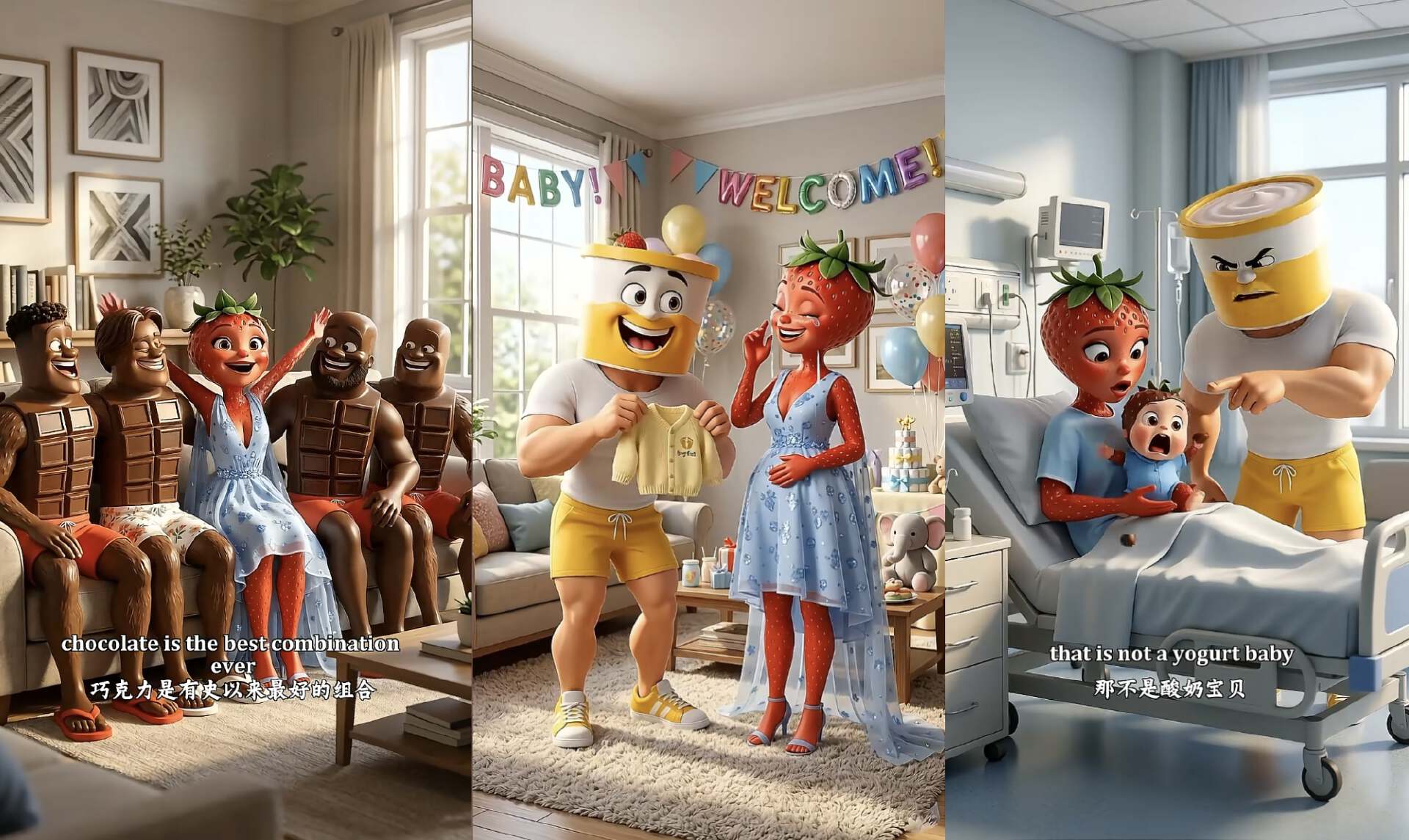 草莓女士和五个巧克力猛男进行群体交流,生出来草莓巧克力宝宝,酸奶丈夫一怒之下把草莓和巧克力放进榨汁机进行严肃惩戒。