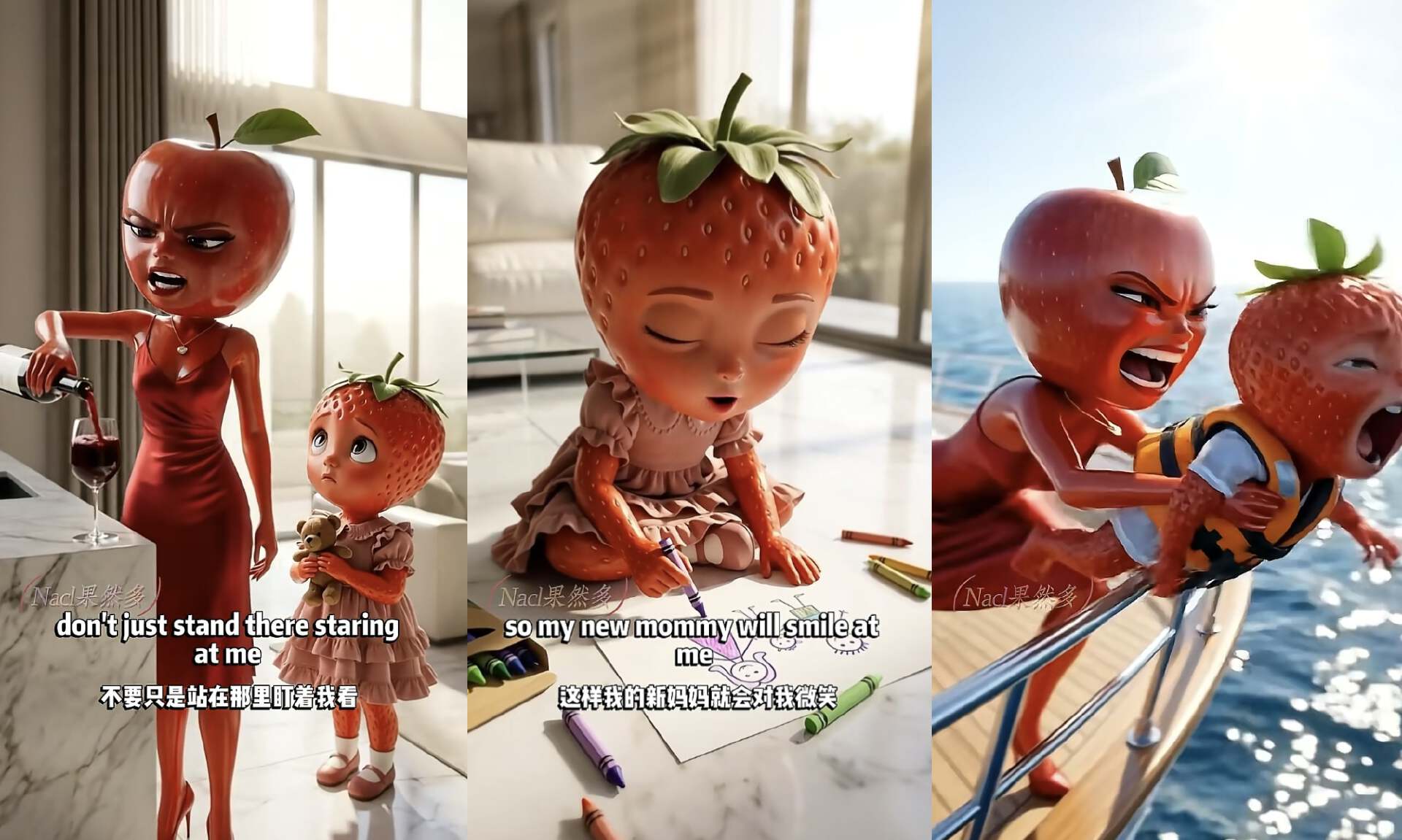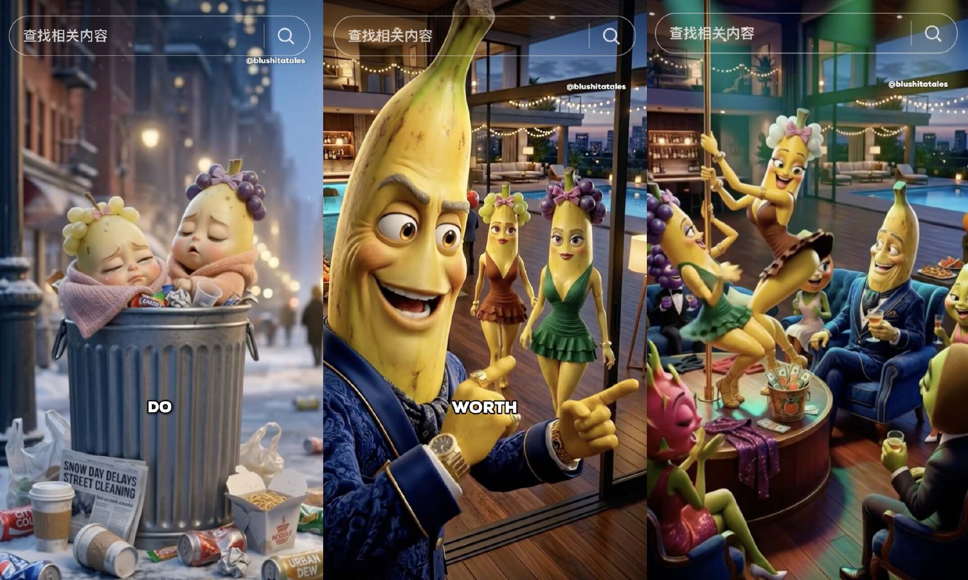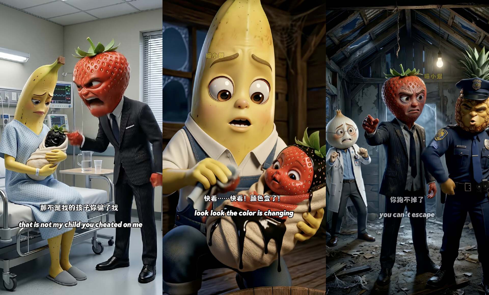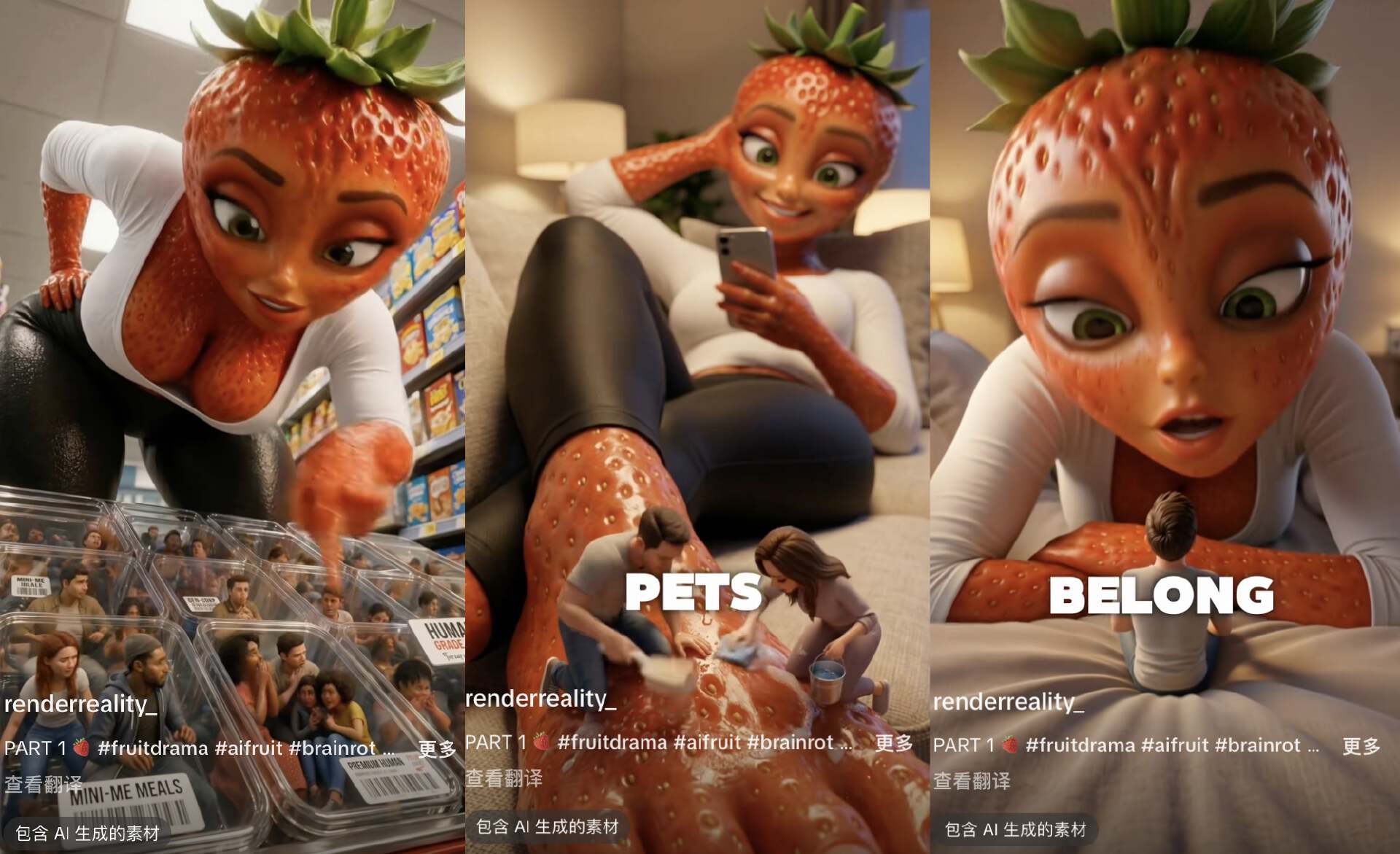 现在甚至已经出现了“真人翻拍水果AI短剧”。