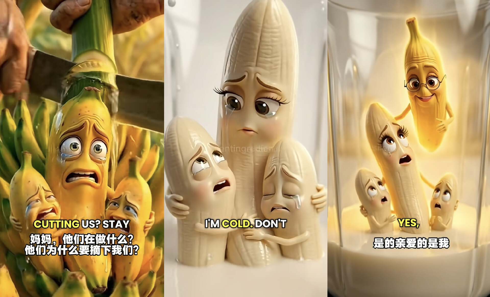 香蕉妈妈和香蕉宝宝被人类从树上残忍地割下来,然后被送进人类的厨房,香蕉一家人被送进榨汁机做成了奶昔,临死前妈妈还抱着孩子。这段似乎在十年前的美国恶搞动画片《香肠派对》里有过致敬。