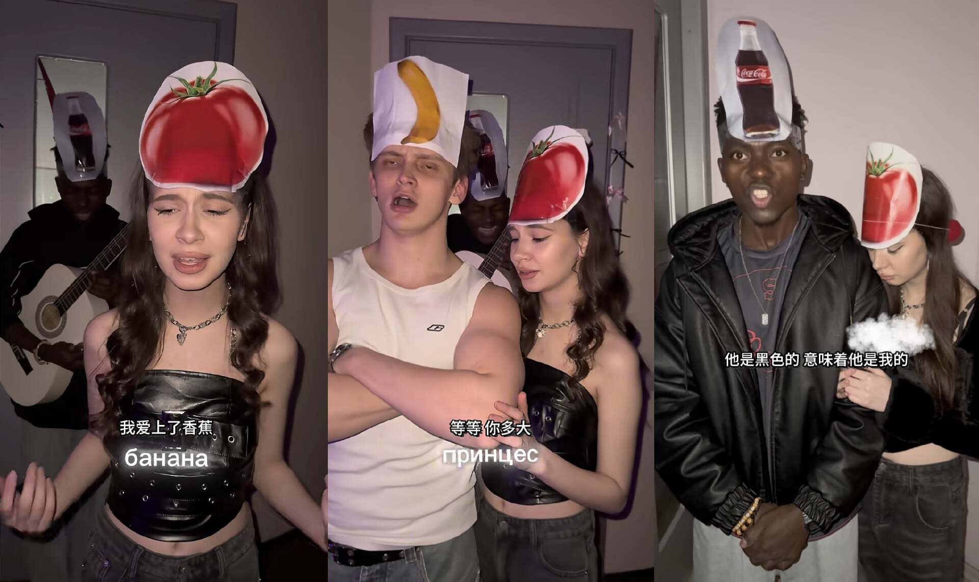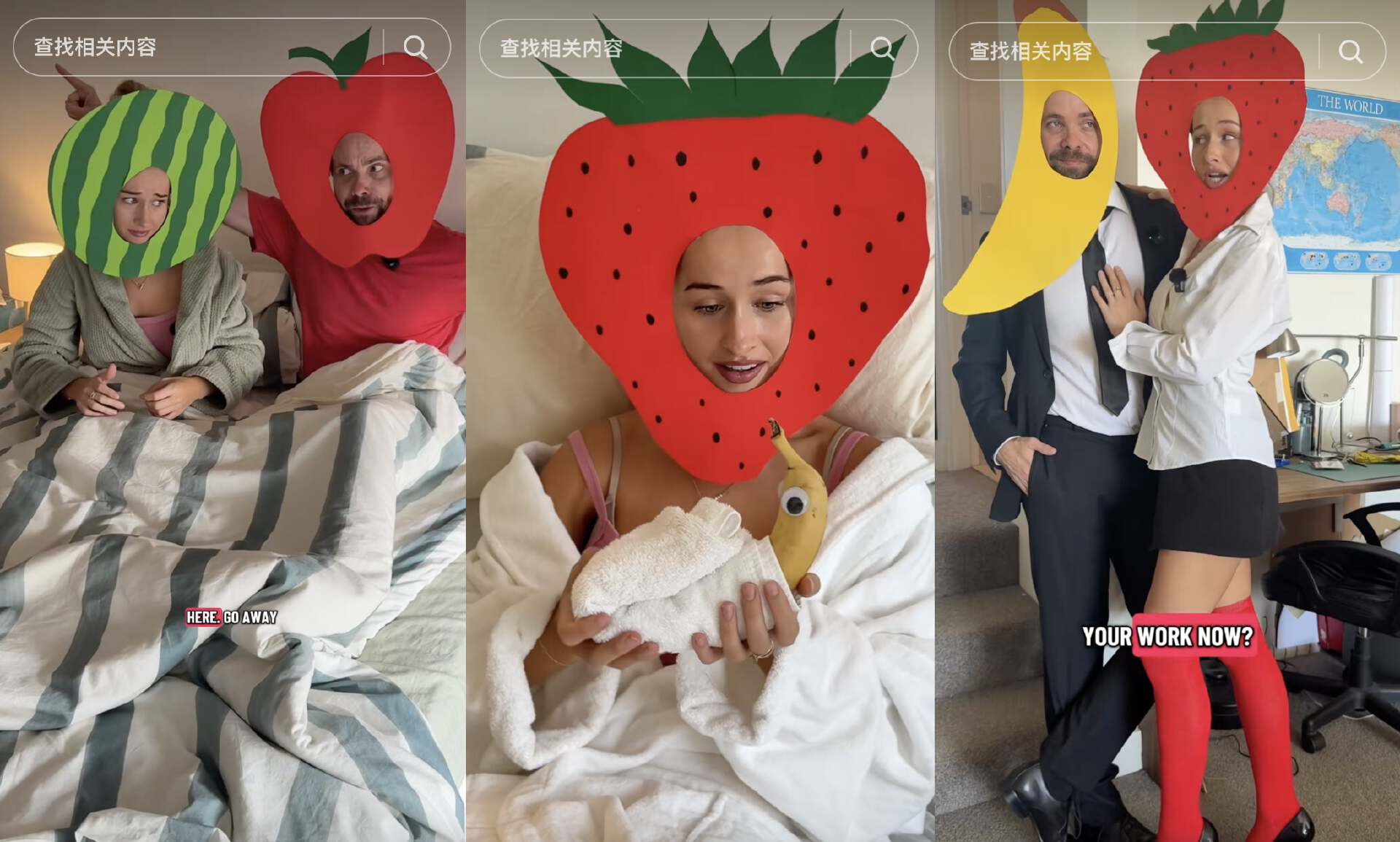 来自美国和俄罗斯的网友,给自己头上戴上水果符号,就这么在自家客厅酣畅淋漓地演起来了。