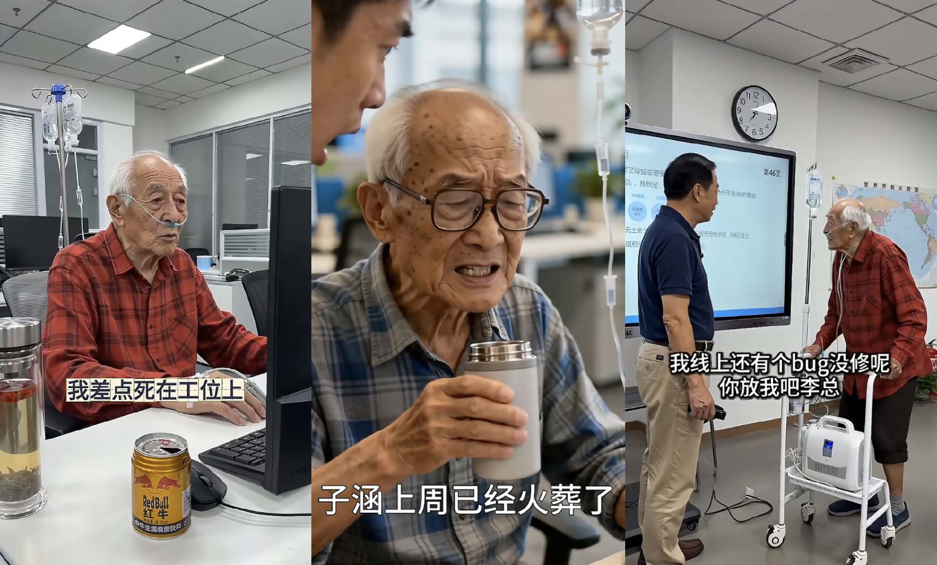 这三个快挂了的老头程序员要负责4条业务线,17个系统,300多个接口。工位上挂着点滴,手上扎着留置针,鼻子上插着氧气。