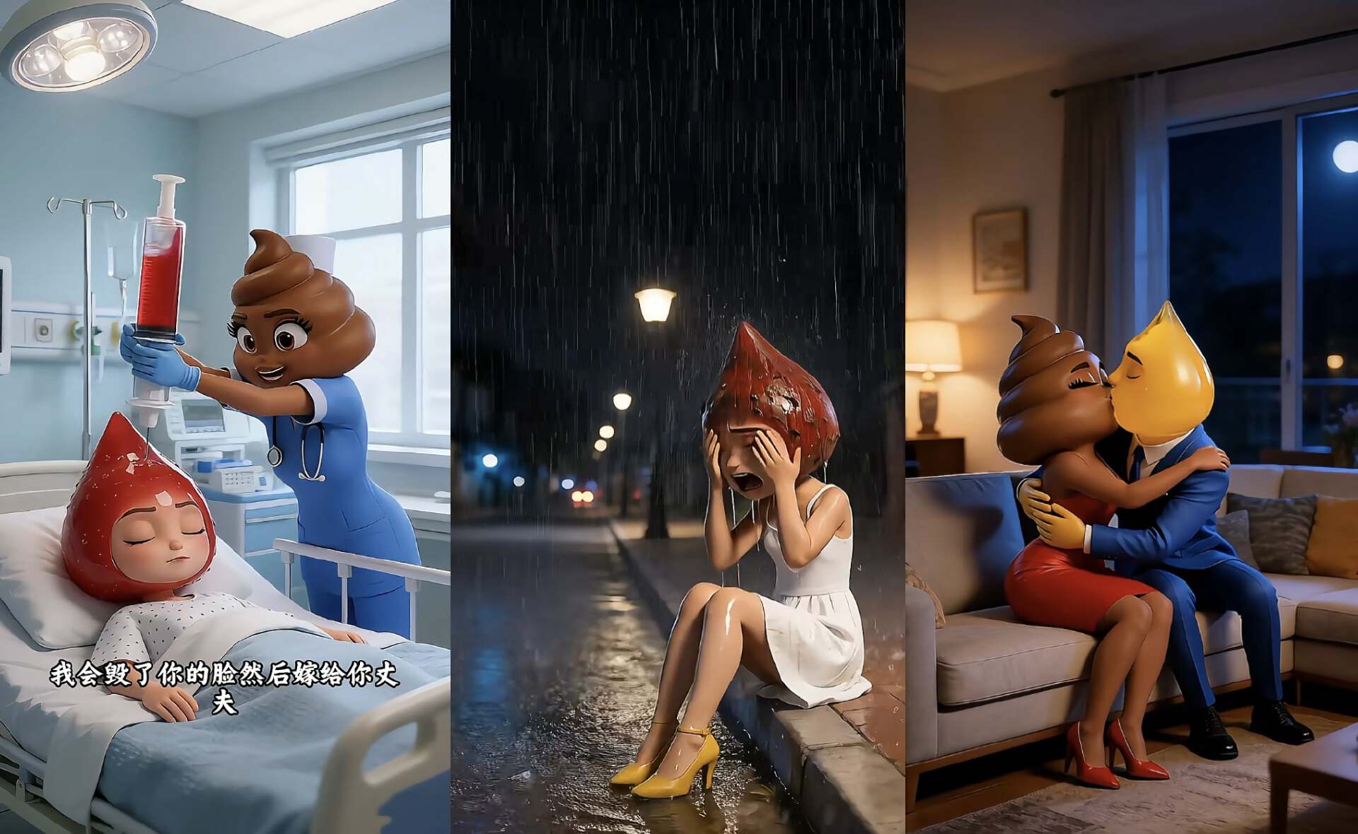 大便姐觊觎尿液哥,于是悄悄给血液姐投毒,血液姐变丑之后被赶出家门,然后屎尿两人幸福地拥吻在一起了。