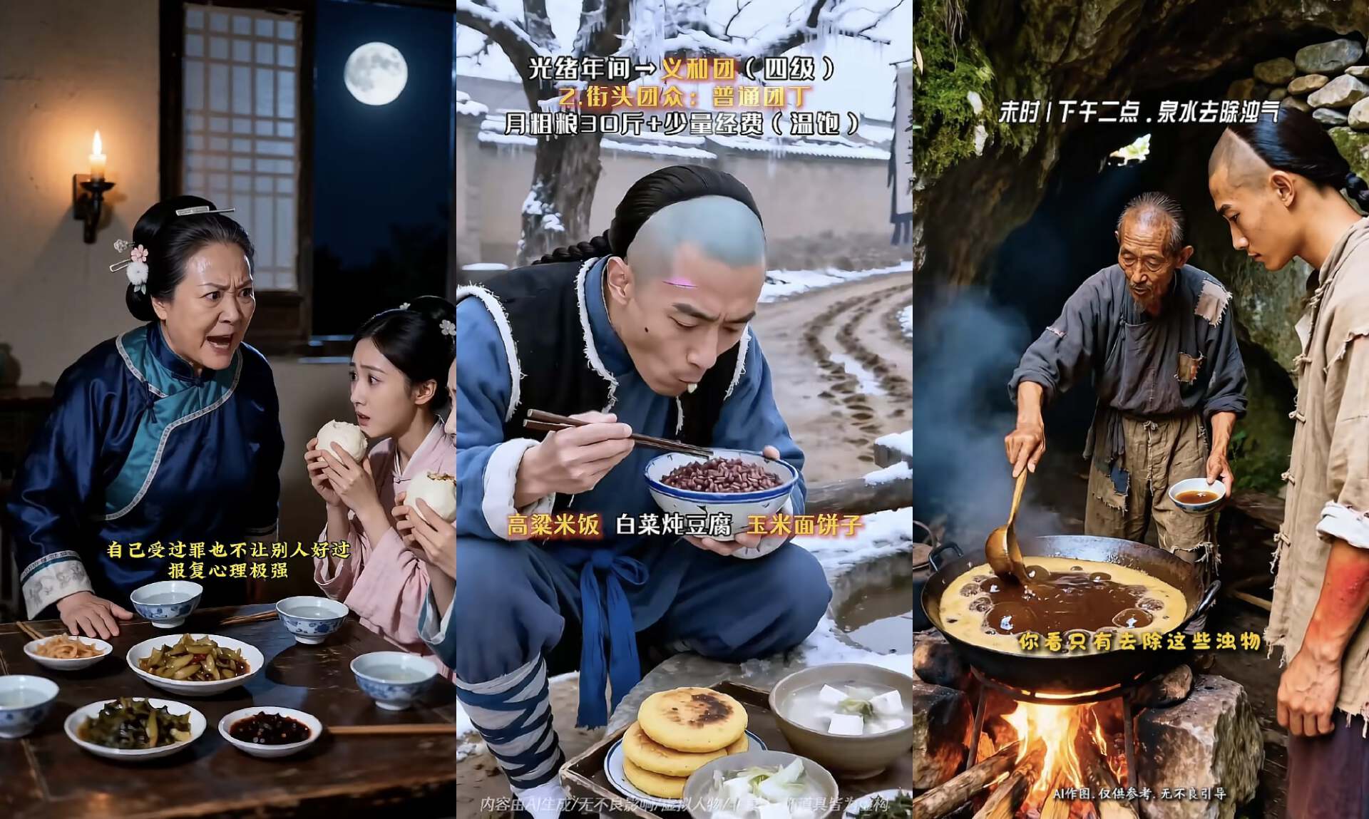 这一类AI视频套用了现代vlog的形式,展现每个年代不同社会阶层的人的生活品质与吃穿住行。从每天睡醒一睁眼开始,一直记录到闭眼睡觉结束,虽然AI伪人感拉满,但作为科普视频还算有趣味。