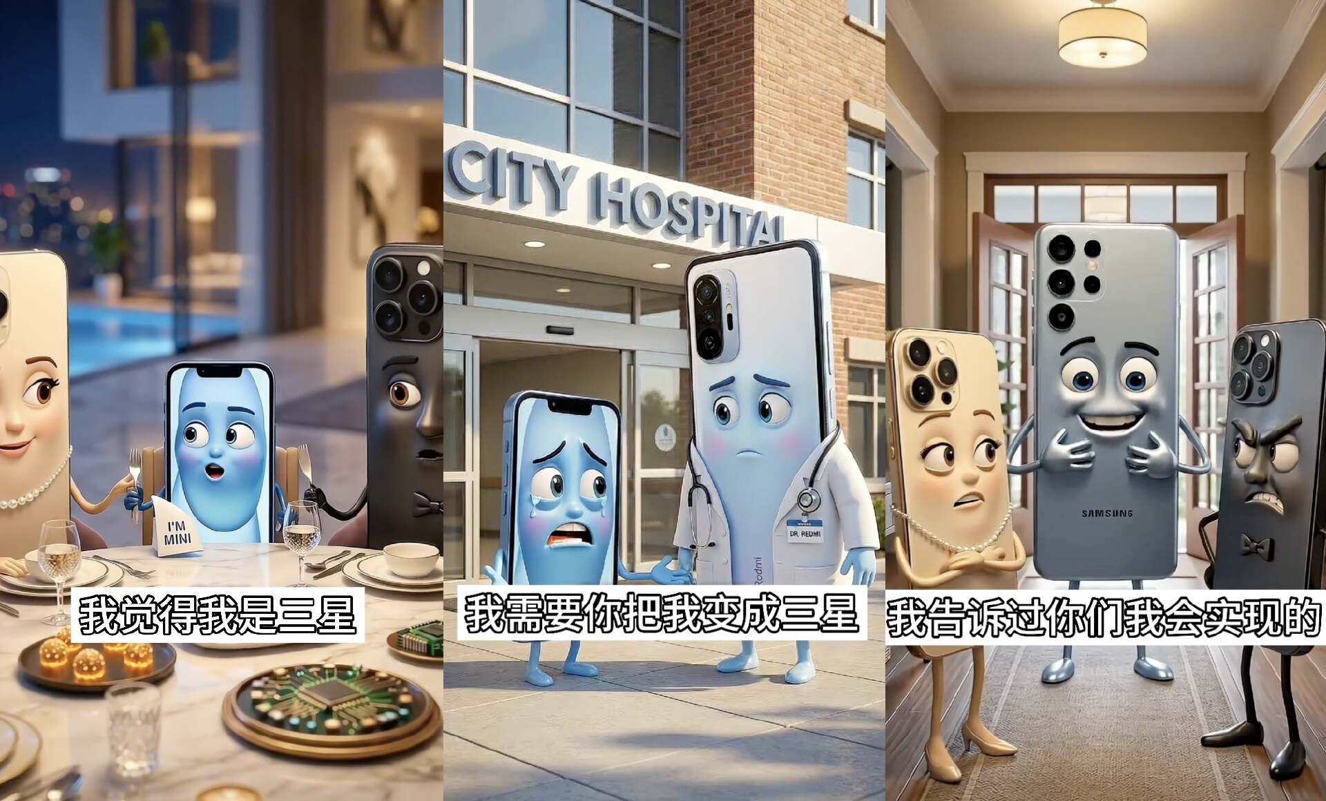 比如小iPhone的性别认知是三星手机,于是在18岁生日那天瞒着父母去医院做了变性手术,回家把自己的iPhone父母气得半死。