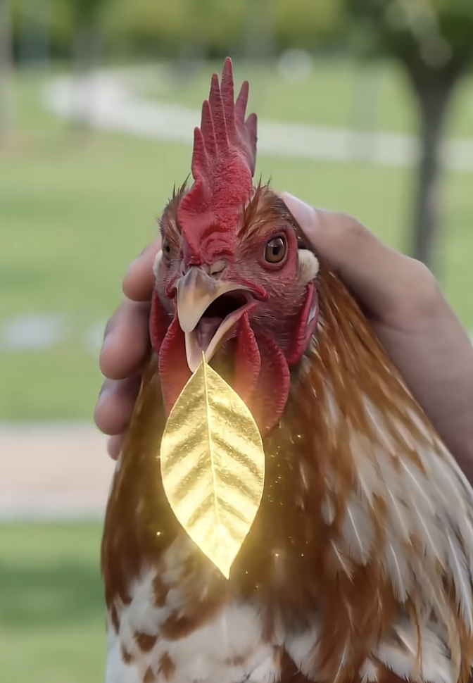 还有人用AI开擦边玩笑。画面里的男性抱着一只公鸡,女性抱着一只白色的老虎,老虎吞掉公鸡的头部,公鸡的嘴里吐出金色的树叶。