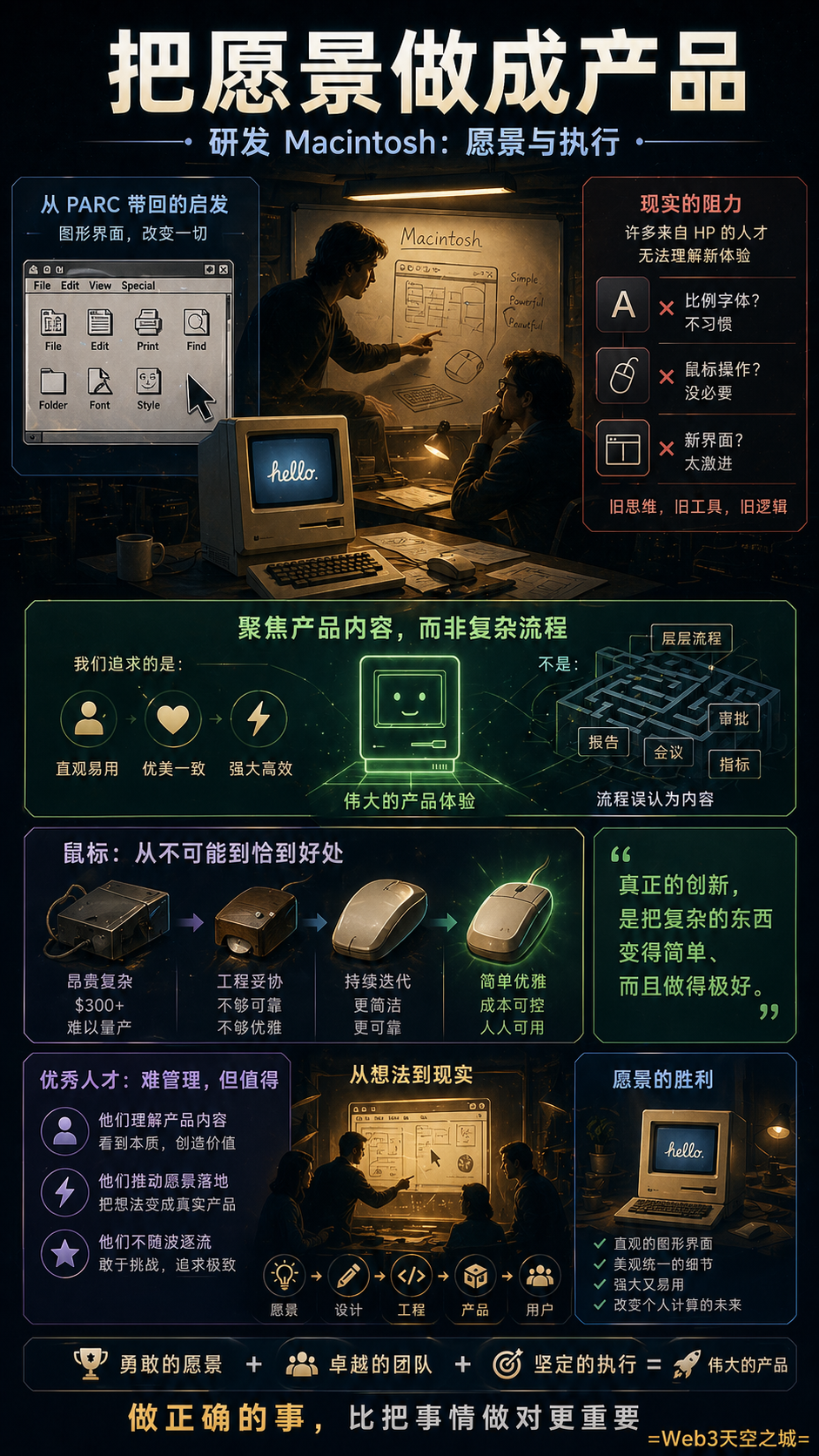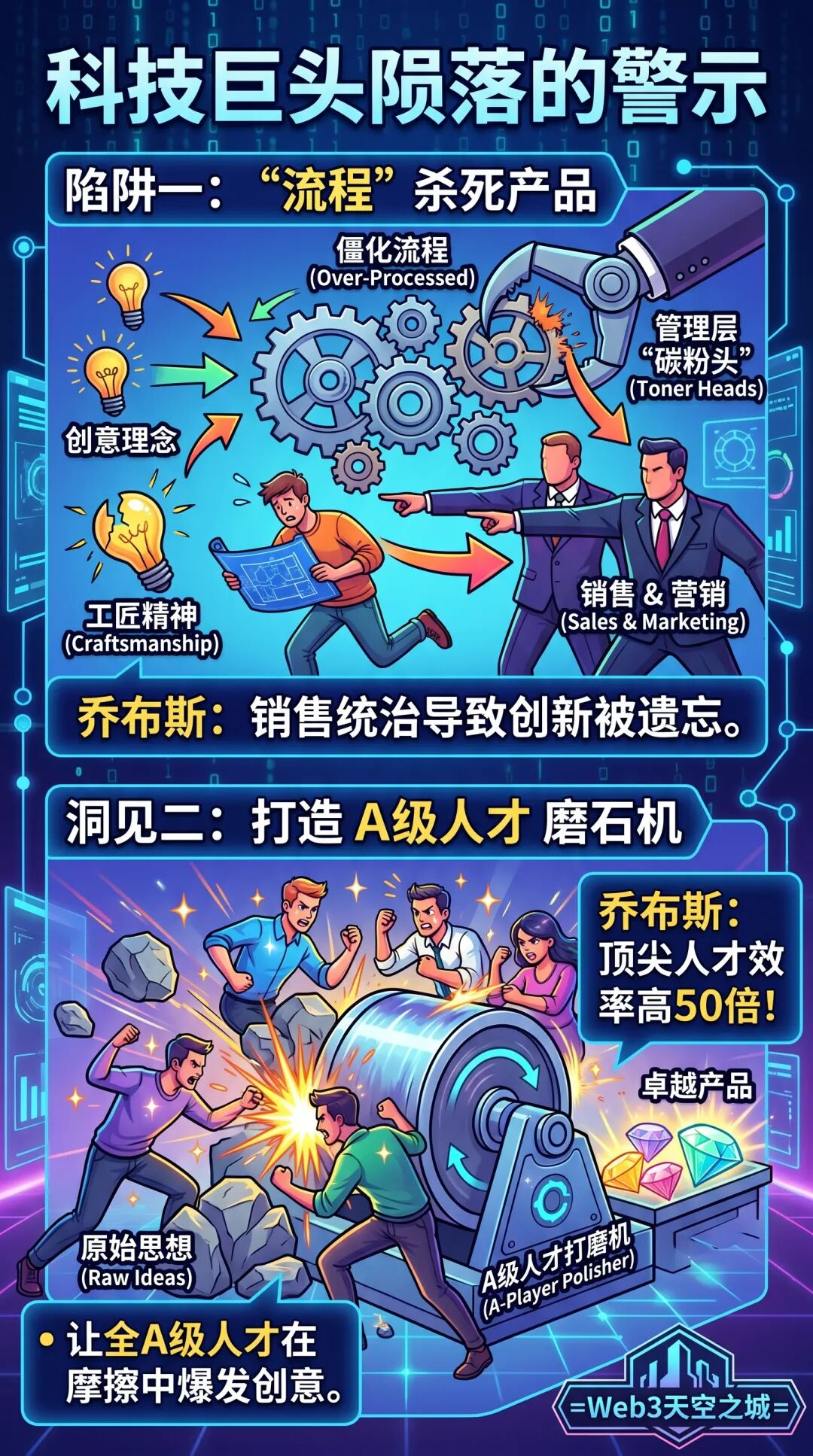 这些被他称为“碳粉头”的管理层,往往对产品本身的细节和工匠精神一窍不通。“他们对于将一个好的创意转化为一个好产品所需的工匠精神毫无概念。没过多久,人们就陷入了一种极大的困惑,误将流程本身当作了核心内容。”乔布斯指出,这种“流程至上”的文化会腐蚀企业文化,导致产品开发人员被挤出决策层,最终使公司遗忘打造卓越产品的本能。