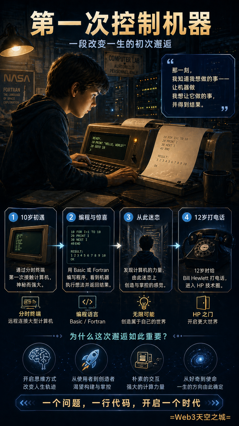 对我而言,计算机依然带有一丝神秘感,因为它连接在电线的另一端,而我从未真正见过计算机的本体。在那之后,我参观了一些计算机,并看到了它们的内部结构。后来,我成为了Hewlett-Packard一群人中的一员。我12岁时,给当时住在Hewlett Packard的Bill Hewlett打了电话。这再次暴露了我的年龄,但那时还没有非公开电话号码这一说,所以我可以直接查到。在电话簿里查到了他的名字。