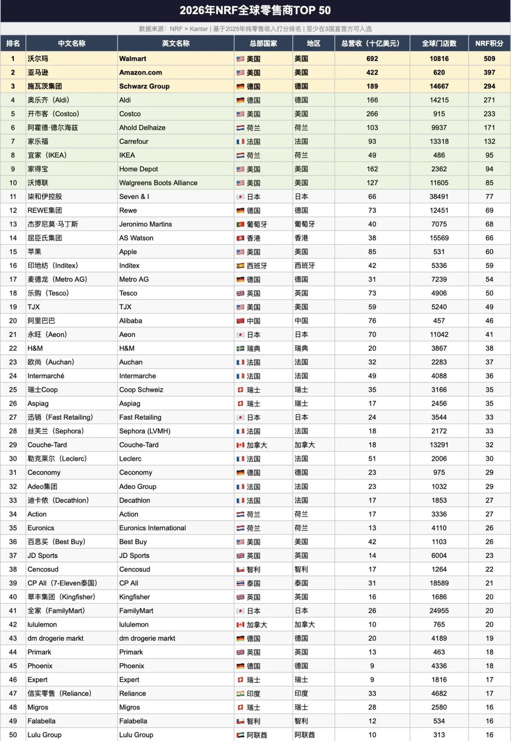 近日,美国零售联合会(NRF)联合凯度(Kantar)发布“2026年全球零售商TOP50榜单”。看起来这是一个行礼如仪的惯常的年度排行榜,但如果深入研究会发现这是一份关于经营范式切换的行业诊断书。