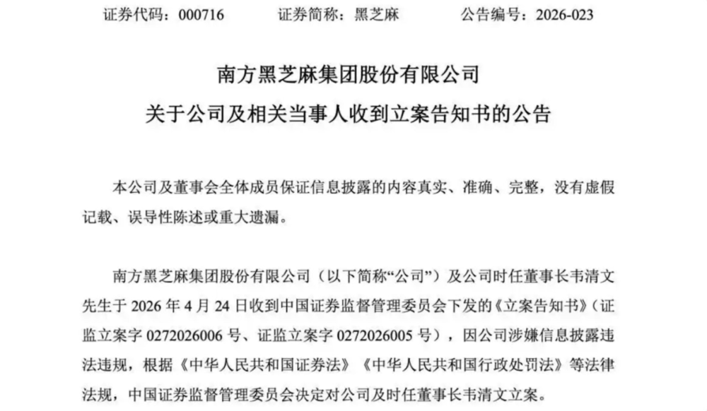 近日,南方黑芝麻集团股份有限公司公告称,中国证监会决定对南方黑芝麻及公司时任董事长韦清文立案调查,案由为涉嫌信息披露违法违规。