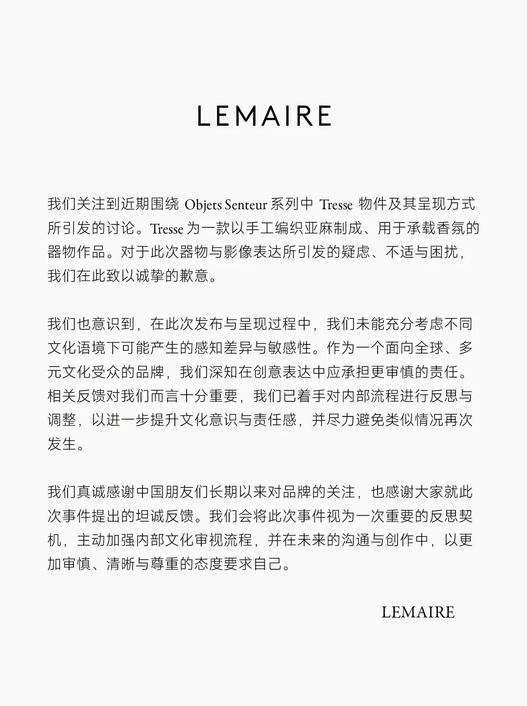 从致歉声明看,Lemaire已意识到问题所在。但对正处高速扩张期的品牌而言,单次道歉或许远远不够,建立长期、系统的文化审核与沟通机制更为关键。在中国市场,消费者为产品买单的前提,是品牌能展现出对本土文化足够的尊重与理解。