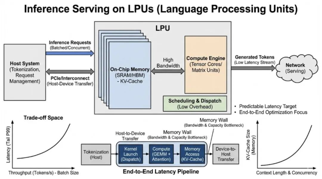 推理服务经常瓶颈在内存容量和带宽,特别是长上下文和高并发场景下KV缓存的增长。LPU风格的设计目标是减少调度开销、提升可预测性,但依然要处理批处理(吞吐)和延迟之间的根本权衡,还有计算配置和内存系统设计之间的平衡。