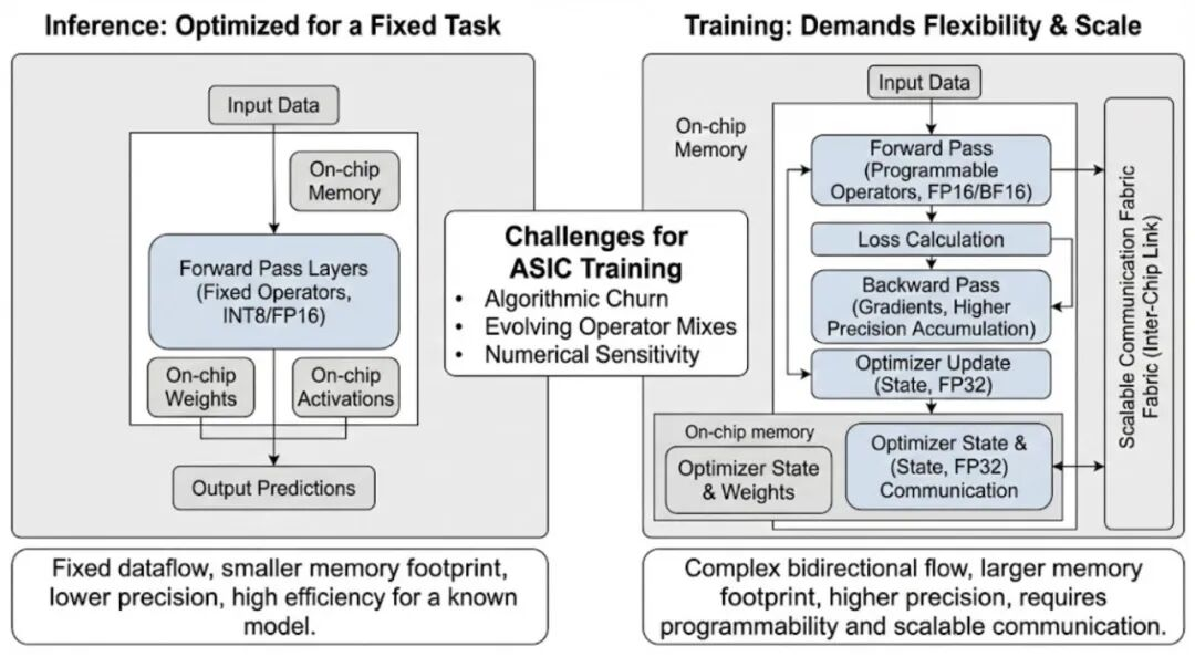 但这不代表ASIC不能做训练。只要选好原语集(矩阵乘、集合通信、足够有表达力的编译器/运行时),特定领域的训练系统依然能在能效比上做到很强。