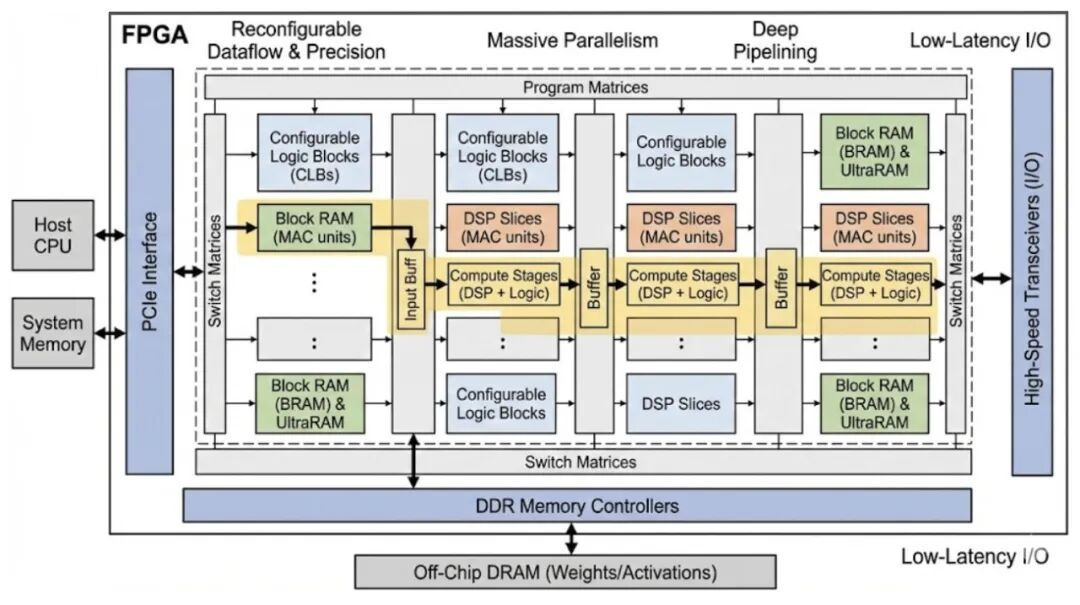 FPGA加速器通常用深度流水线的流式架构、自定义精度、专门的内存布局,还能和传感器、网络紧耦合来降低端到端延迟。