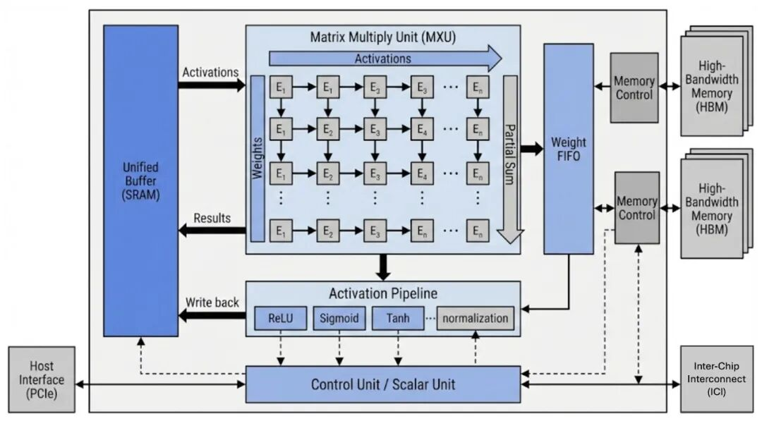 既然神经网络大部分时间都在算矩阵乘,那就把芯片面积尽可能多地堆计算单元,同时设计专门的数据通路和内存层次,减少数据搬运的开销。