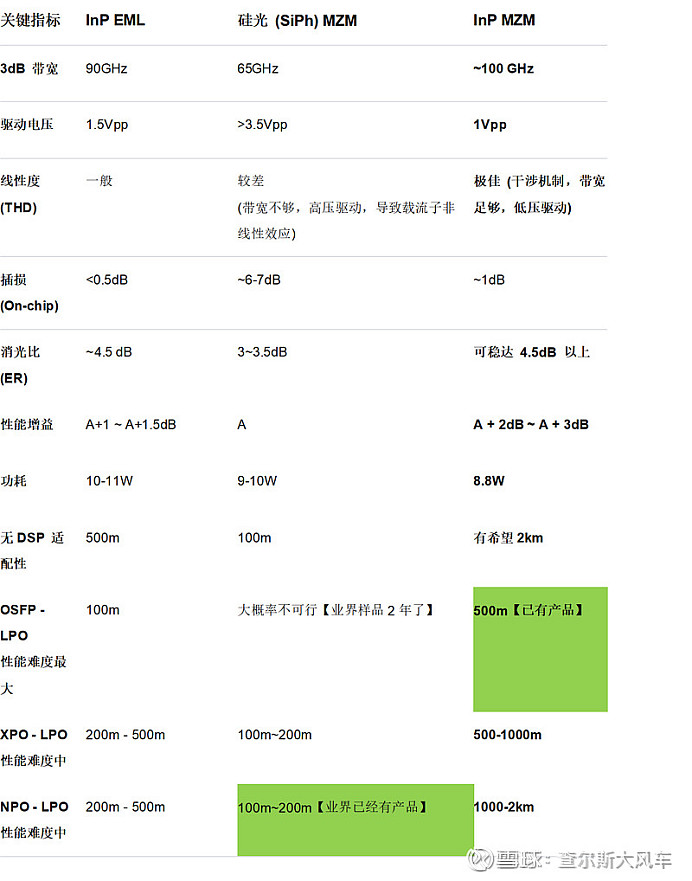 InP 的成本比较贵,做功分这种无源器件, MZM 自身尺寸问题等。成本高;所以InP MZM 在早期应该还是主要应用在价值高的场景:LPO@DR8、LRO@2xFR4 以及OCS场景。