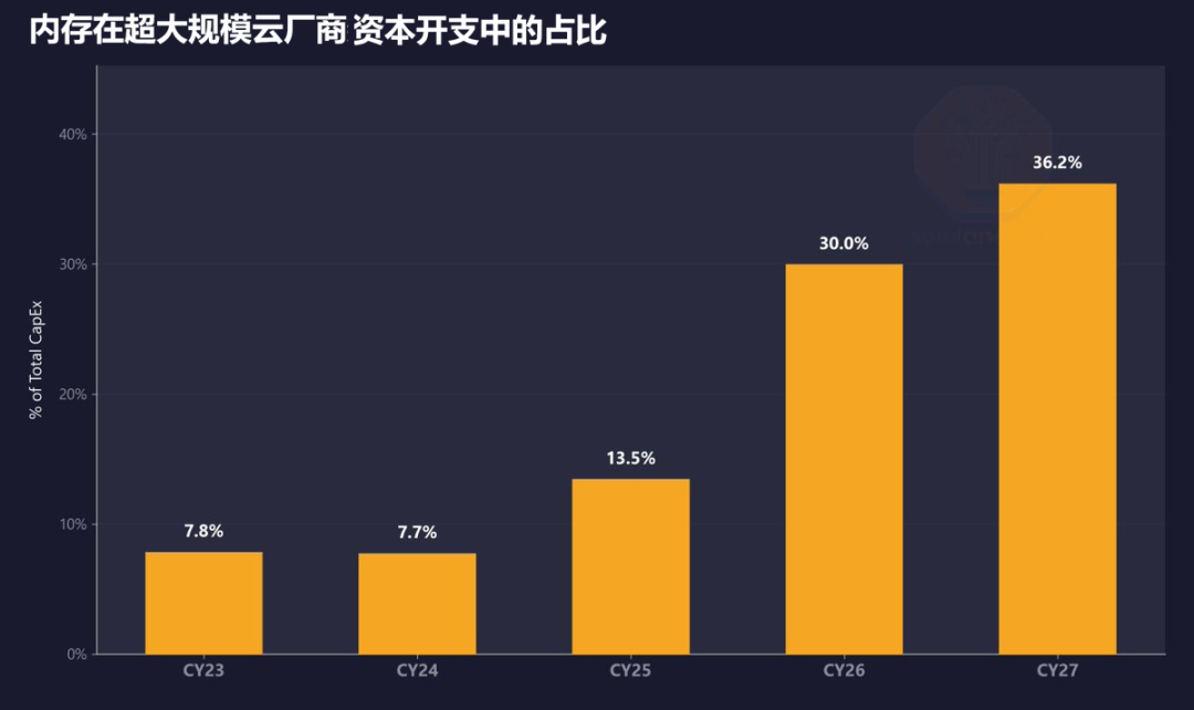 内存已经开始接管数据中心的资本支出。据分析机构semianalysis统计,在短短四年内,这一数字增长了近4倍。在回复分析师的提问时,几家科技巨头的高管,几乎都提到了内存等组件的涨价;即使不买更多的GPU,也将推高几家巨头的资本支出。微软最直接,首席财务官提到在2026财年全部资本开支的1900亿美元中,其中包含250亿美元来自存储芯片等组件价格上涨的冲击。