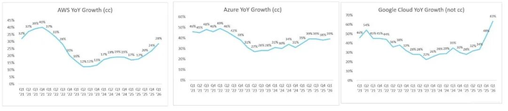 云收入是AI吃掉世界的关键证明之一。由于OpenAI星门建设缓慢,Anthropic也不自建算力,全球大多数的token生产与消耗,都集中于这些科技巨头的AI基础设施中。当季,谷歌云季度收入200亿美元,增速63%,较上一季度提高15个百分点;微软云收入545亿美元,其中Azure同比增长超40%;亚马逊AWS收入约376亿美元,增速28%,15个季度以来最快。